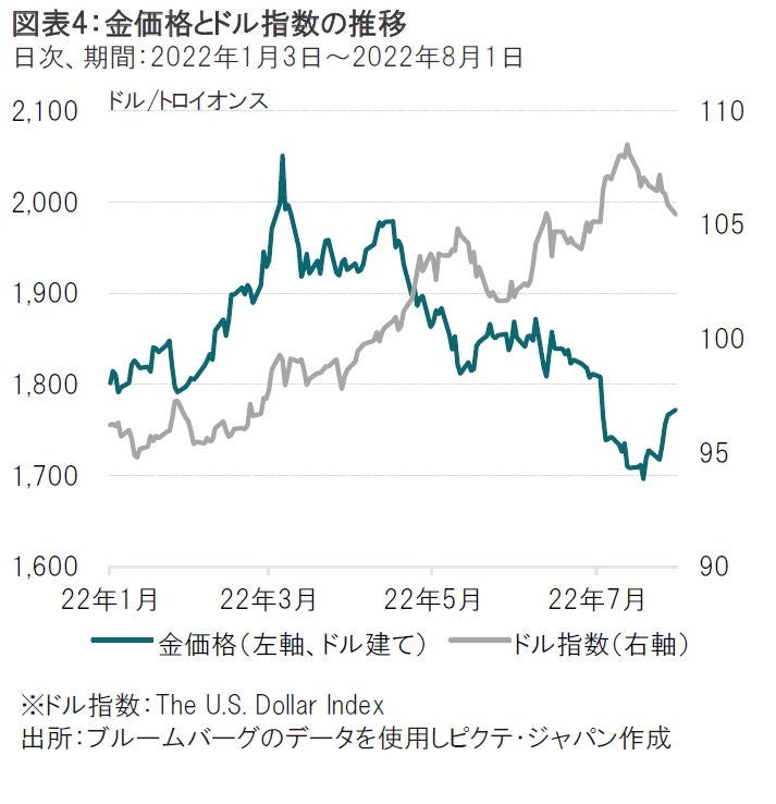 また、金の売り材料となっていた、年初から進行していたドル高も7月にドル安へと転じてきている(図表4参照)。ドル指数は金利との連動性が高く、年初来の金利上昇によりドル高傾向が続いたが、金利が低下へと転じるとドル安傾向に転じてきている。