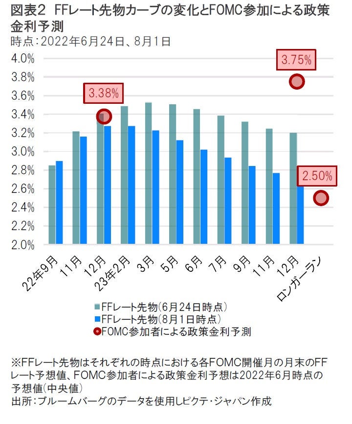 7月の米連邦公開市場委員会(FOMC)での利上げ幅が前会合同様の0.75%となり、3月から会合が進むたびに利上げ幅が拡大していた流れが止まった。さらに市場では2023年末にかけての利下げまでも織り込みはじめている(図表2参照)。