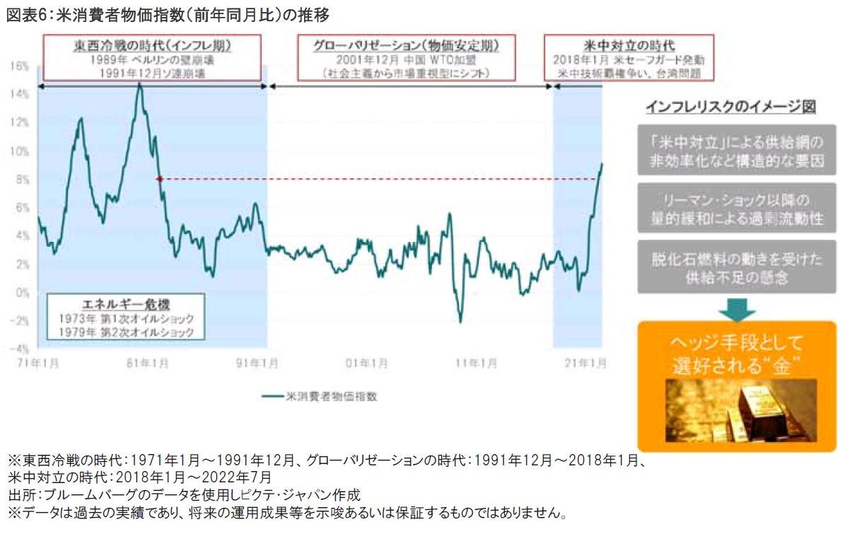 もともと金にはインフレへの備えに加え、株式や債券とは異なる動きを示す分散効果と、不確実性の高まりへのヘッジ効果も期待される。米中覇権争いから端を発した世界の分断の進展やリーマンショック以降の大量の流動性の供給の影響など、ロシアによるウクライナ侵攻が起きる前から、世界には様々な構造的なインフレの高止まりの要因が存在している(図表6参照) 。また、ウクライナ問題のみならず、台湾問題など、地政学的なリスクも依然として高い状態にある。