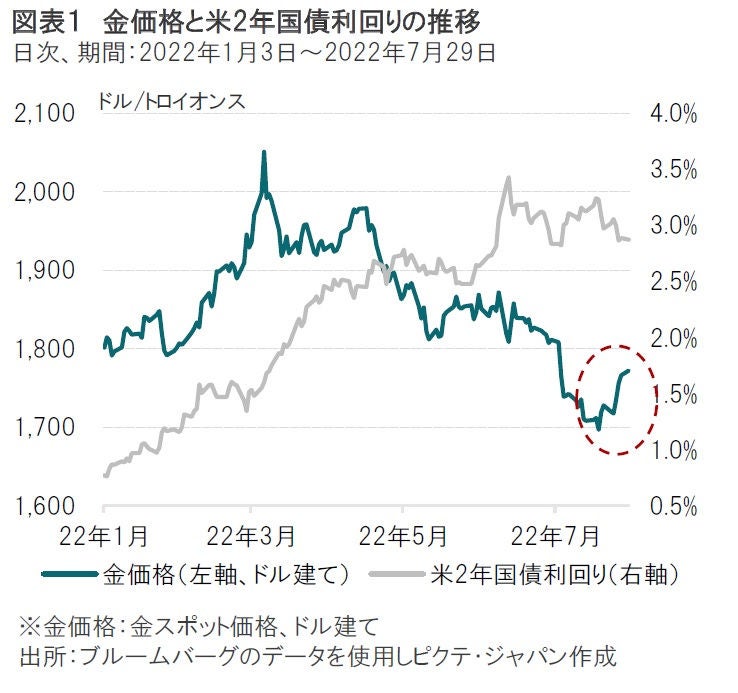 金スポット価格は3月上旬に年初来高値(2070.44ドル)をつけた後、7月中旬にかけて調整をつづけ約2割下落したが(1680.99ドル)、再び上昇に転じ、8月1日には一時1トロイオンス1788.05ドルまで上昇した(図表1参照)。
