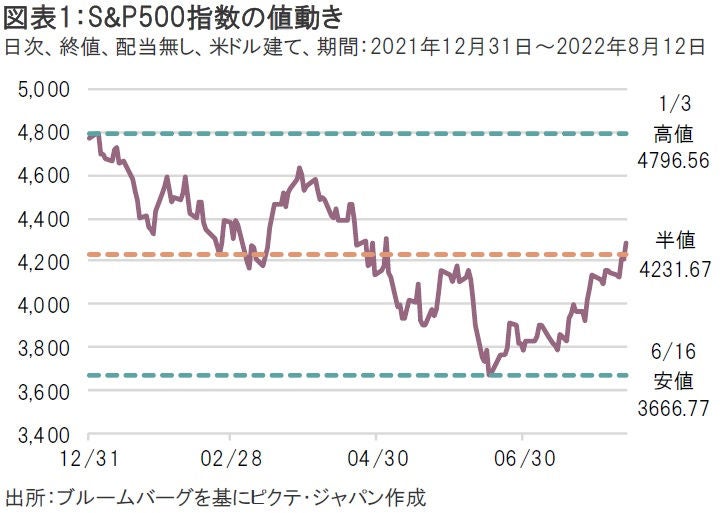S&P500指数は8月12日、今年1月3日の高値(4796.56)と6月16日の安値(3666.77)の半値である4231.67を超える「半値戻し」を終値ベースで達成した(図表1)。「半値戻しは全値戻し」の相場格言に従えば、「強気シグナル点灯」ということになる。しかし、当然のことながら相場に絶対は無い。相場格言の勝率が百発百中であれば、苦労せずとも「アノマリー(理論的根拠は無いが良く当たる経験則)」による恩恵を享受することが可能だが、現実はそう甘くはない。