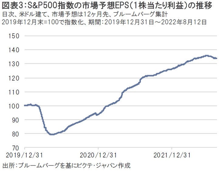 S&P500指数が「半値戻し」を達成した一方で、「市場予想EPS(1株当たり利益)」、すなわち業績見通しは悪化した(図表3)。コロナショック以降、この市場予想EPSは右肩上がりで堅調に推移し、S&P500指数上昇の原動力になっていた。だが、世界的なインフレ圧力の高まりやFRBによる急激な金融引き締め政策、中国のゼロコロナ政策等によって、市場予想EPSはコロナショック以来の低下トレンドへ転換した可能性がここにきて出てきた。一時的な鈍化に過ぎない可能性もあるが、S&P500指数の値動きを左右しかねない重要な指標であるため、今後の動向に注意を払う必要がある。S&P500指数がベアマーケット(弱気相場)を完全に脱出したと宣言するには時期尚早だろう。