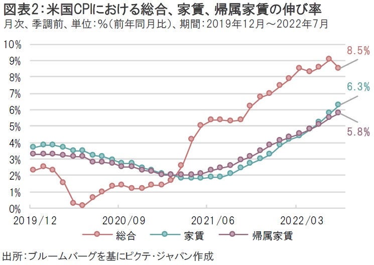 相場の急上昇をけん引したのが、「インフレ・ピークアウト」→「今年の利上げペース鈍化/来年は利下げ転換」→「株高」というシナリオ(観測)であれば、インフレが本当にピークアウトして、米連邦準備制度理事会(FRB)のインフレ目標である2%へ収束する道筋が見えてくるかが今後の焦点になってくる。たしかに、国際商品市場では原油やガソリン、小麦やとうもろこしなどの価格はすでにピークから下落しており、米消費者物価指数(CPI)がいつピークアウトしてもおかしくない状況だ。しかし、総合CPIの約3割を占める「家賃」と「帰属家賃」は、直近7月時点でもピークアウトの兆しは出ていない(図表2)。「エネルギー」や「食品」はピークアウトするかもしれないが、「家賃」と「帰属家賃」の加速が収束しなければ、当面は2%よりも高い水準で「高止まり」の状態になる可能性もある。そのような状況で、市場の期待通りFRBが来年早々に利下げに転じるかどうかは甚だ疑問だ。