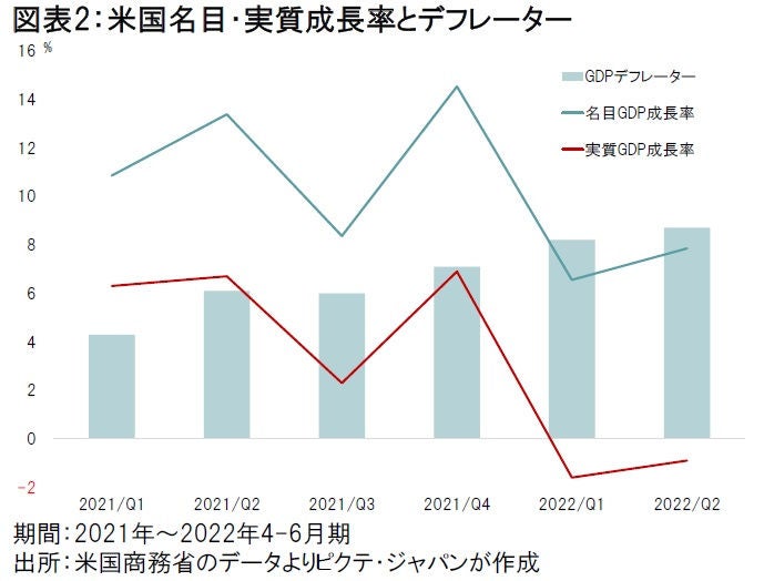 2022年における米国経済は、既に終わった前半2四半期が実質ベースの前期比・年率で連続のマイナス成長になった(図表2)。しかし、この両四半期とも名目成長率は6.6、7.8%と高く、70%近くを占める個人の消費支出は、堅調な雇用環境を背景に名目ベースでは伸びている。