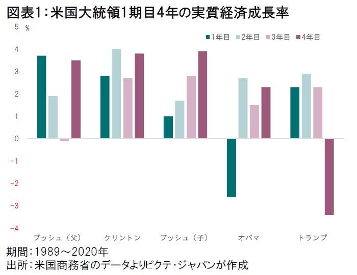 直近5人の大統領の1期目における実質成長率を見ると、再選されたクリントン、ブッシュ(子)、オバマ3大統領は中間選挙後の2年間はプラス成長だった(図表1)。これに対し、再選に失敗したジョージ・H・W・ブッシュ(父)、トランプ両大統領は、3、4年目のいずれかの年がマイナス成長だ。つまり、大統領再選の重要な鍵は、中間選挙の結果ではなく、中間選挙後2年間の米国景気の動向に他ならない。