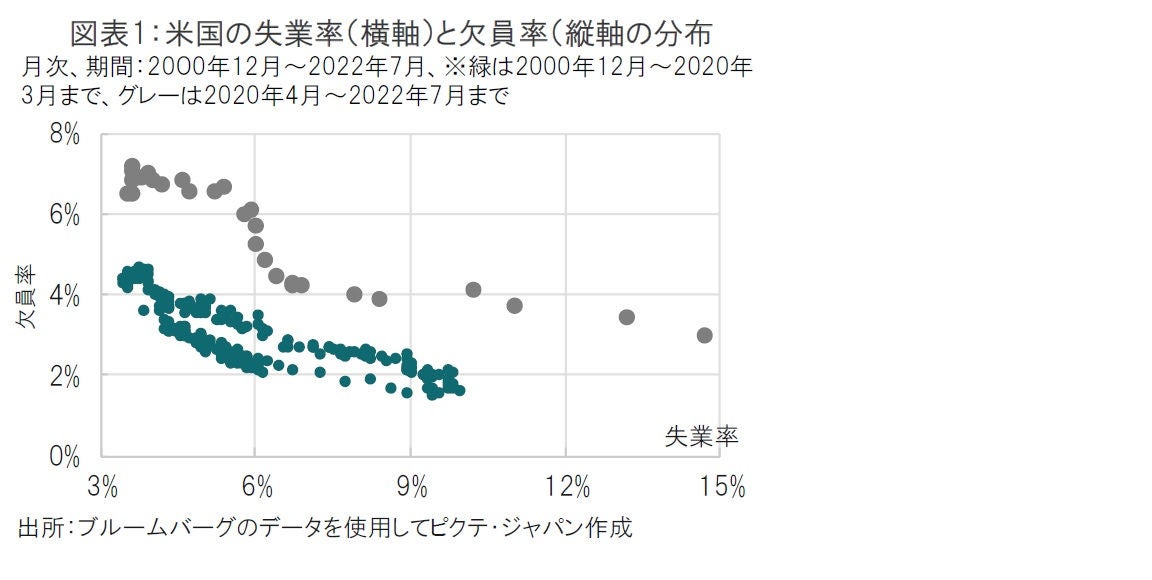 比較的安定していることから、求人(件数)が多いほど労働市場が過熱しているというイメージです。横軸は失業率で、この組み合わせを2000年12月からプロットしたのが図表1です。求人と失業率との関係は一般にベバリッジ曲線と呼ばれていますが、FRBではウォラー理事などがこの曲線の分析に関するレポートを公表し、サマーズ氏と論争しています。