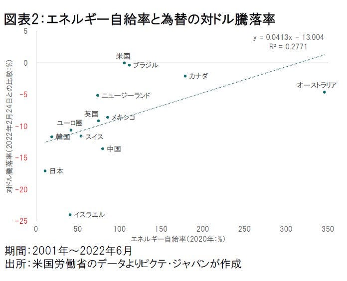 ロシアがウクライナに侵攻した2月24日を起点に、ドルをベンチマークとして主要国・地域通貨の変動率とエネルギー自給率との関係を見ると、統計的に概ね正の相関が示された(図表2)。例えば、エネルギー自給率が100%を超えているオーストラリア、カナダ、ブラジルは、通貨の対ドル下落率が相対的に小さい。エネルギー自給率727%で図表2に収まらないノルウェーの場合、クローネは対ドルで9.6%上昇した。