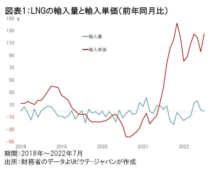 化石燃料の内訳を見ると、LNGは輸入量が前年同期比3.1%減少したものの、輸入額は98.9%増だ(図表1)。また、石油は輸入量が前年同期比11.5%の増加に対し、輸入額は106.5%増加している。さらに、石炭は輸入量が3.0%増、輸入額は223.5%増だった。