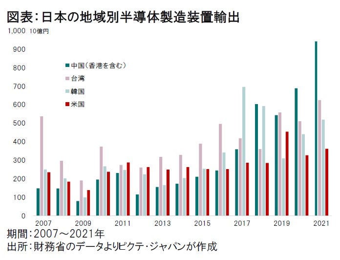 インテル、マイクロン、クアルコム、エヌディビアなど先端的な設計技術を持つ半導体メーカーを擁する米国だが、製造技術は台湾、韓国に及ばない。また、半導体メーカーとしては後退著しい日本だが、シリコンウエハーや素材、製造装置に関しては競争力を有している。Chip 4の枠組みのなかで、半導体の対中輸出が広範に認められる一方、半導体製造装置の輸出は難しくなる可能性が否定できない。これは、対中輸出の拡大で業績を伸ばしている日本の関連企業には痛手となる可能性があり、Chip 4での議論が注目される(図表)。