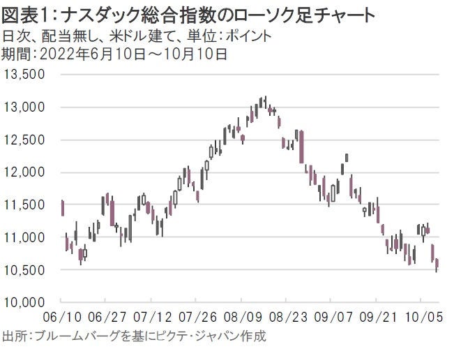 10月10日のナスダック総合指数は前日比1.04%安となり、今年6月16日につけた年初来安値(終値)をさらに更新する展開となった(図表1)。