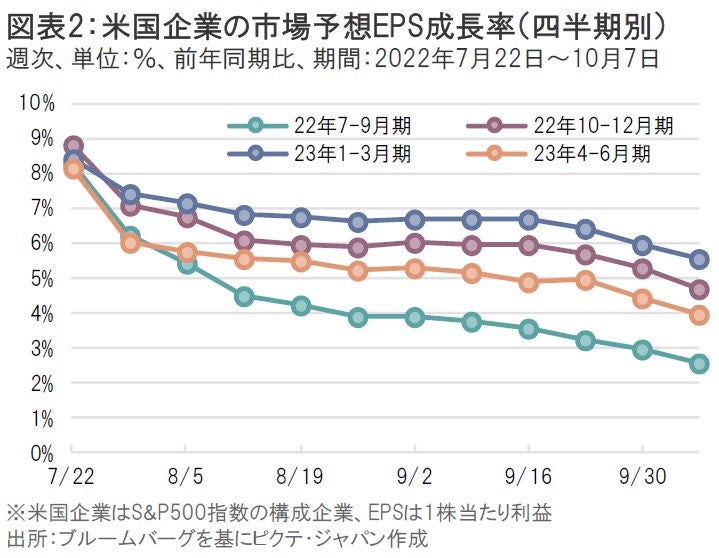 さらに警戒感が高まっているのは、企業業績見通しの下振れリスクだ。米国企業全体の市場予想1株当たり利益(EPS)成長率は緩やかに鈍化しているとはいえ、目立った下方修正は見られない(図表2)。