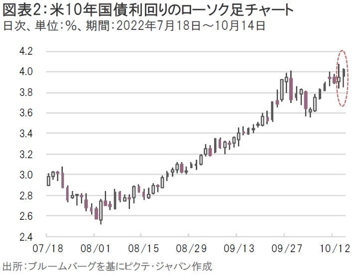 14日(金)の米国債券市場では、前述した材料等をきっかけに米10年国債利回りが4.0%台で取引を終えた(図表2)。