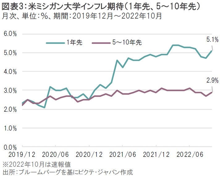 米ミシガン大学消費者調査におけるインフレ期待において、1年先のみならず、5~10年先の長期におけるインフレ期待も前月から再加速した点は見逃せない(図表3)。