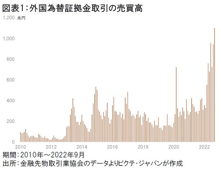 また、金融先物取引業協会のデータにれば、FX事業者を通じた個人の外国為替証拠金取引による円・ドルの取引高は、9月、1,098兆円に達し、初の1千兆円台となった(図表1)。