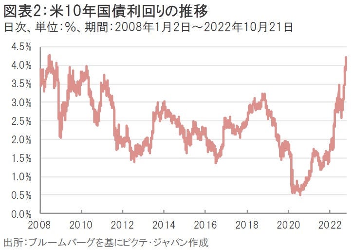 米10年国債利回りは幾分低下したとはいえ、依然として高水準であることに変わりはない。実際、米10年国債利回りはリーマンショック前後の水準まで急上昇しており、債券投資家の損失が拡大していることが推察される(図表2)。