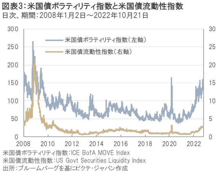 このような中、米国債におけるボラティリティ(変動率)の上昇が顕著となっている。一般的にボラティリティの上昇はリスクの高まりを意味し、特に債券価格の下落時(=金利上昇時)に発生する傾向があるため、ボラティリティの上昇を嫌って債券投資を敬遠する動きが出やすい。このため、米国債における流動性(売買のしやすさ)も低下する傾向にあり、流動性が低下するとさらにボラティリティが上昇するという悪循環が発生しやすくなる。市場では今まさにこの2つの事象が同時に発生しており、金利上昇スパイラルが起こりかねない状況になりつつある(図表3)。