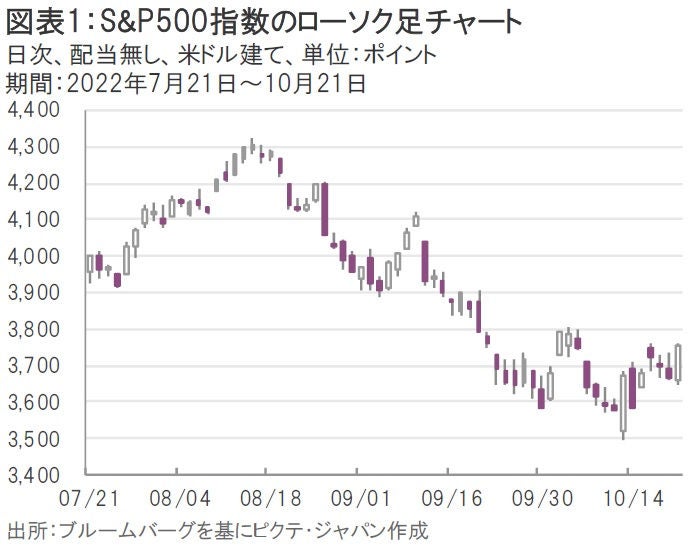 ウォール・ストリート・ジャーナル(WSJ)の著名記者ニック・ティミラオス氏は10月21日、「11月米連邦公開市場委員会(FOMC)では75bpの利上げが予想される中、12月は50bpの利上げへ減速する議論が行われる可能性がある」との観測記事を発表した。さらに、サンフランシスコ連銀のデイリー総裁が「政策金利がターミナル・レート(利上げサイクルの最終到達点)に近づくにつれ、50bpや25bpのより段階的な引き上げに減速するのが適切になるだろう」とコメントしたことなどから、米10年国債利回りは4.3%台から4.2%台まで低下し、S&P500指数は前日比2.37%高と急騰する展開となった(図表1)。