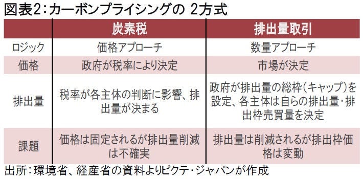 10月26日に開催された『第3回グリーントランスフォーメーション(GX)実行会議』で、岸田文雄首相は、「炭素に対する賦課金と排出量取引市場の双方を組み合わせるハイブリッド型とするなど、効果的な仕組みを検討する」よう指示した。これは、日本のカーボンプライシング制度が、炭素税とキャップ・アンド・トレードの併用となる可能性を意味する(図表2)。