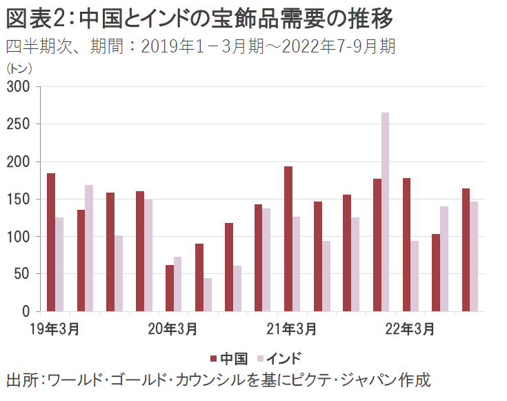 その宝飾品需要の中心は中国とインドだが、まず中国の宝飾品需要をみると7‐9月期は前年同期比5%増の163トンと、緩やかな伸びとなった。新型コロナウイルス関連の散発的な規制が消費者心理を悪化させたものの、主要都市でロックダウン規制が緩和されたことや、人民元が下落したことで金の安全資産としての魅力が再評価されたことが背景にあると見られる(図表2参照)。