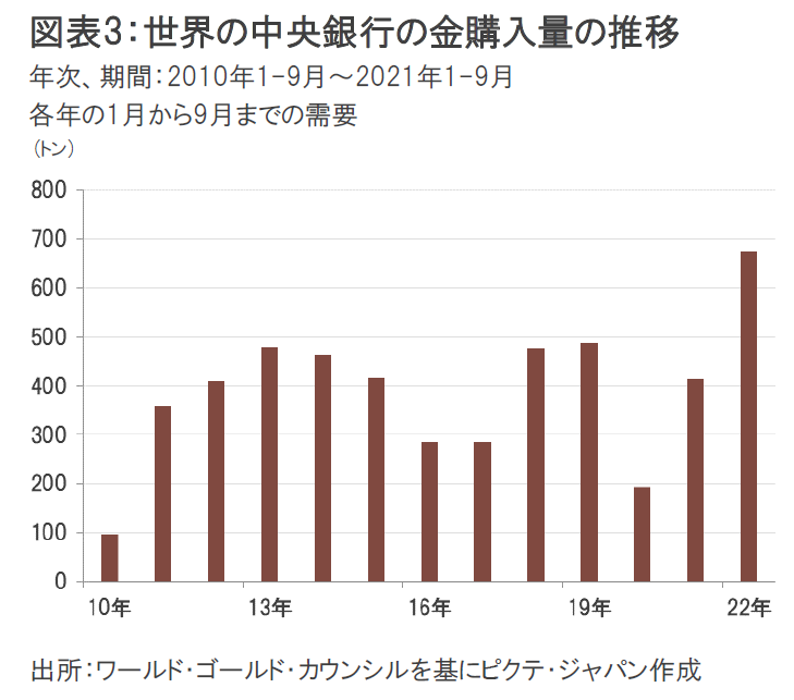 インフレ圧力の高まりと金融引き締めによる世界金融危機への懸念とロシアのウクライナ侵攻による地政学的な不確実性が金購入量増加の主要因となっている。さらには、国際通貨システムの変化や、基軸通貨国の経済リスクの高まりへの新興国の懸念なども反映されたものとみられる。