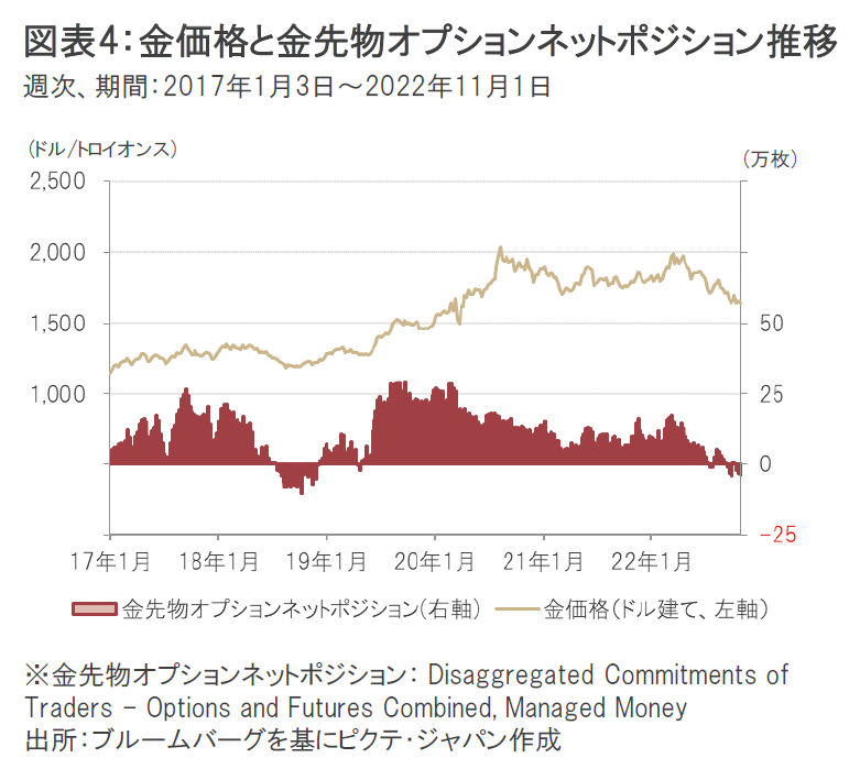 そうした中、投機筋のポジションをみると、ニューヨーク商品取引所(COMEX)の金先物オプションのマネージド・マネーのネット・ポジションは3年ぶりにネット・ショートとなっている(図4参照)。投機筋のポジションは金に対するネガティブなセンチメントをすでにかなり織り込んでいることから、一部の投資家がショートポジションを解消すると、金価格のトレンドが反転し上昇に転じる可能性がある。
