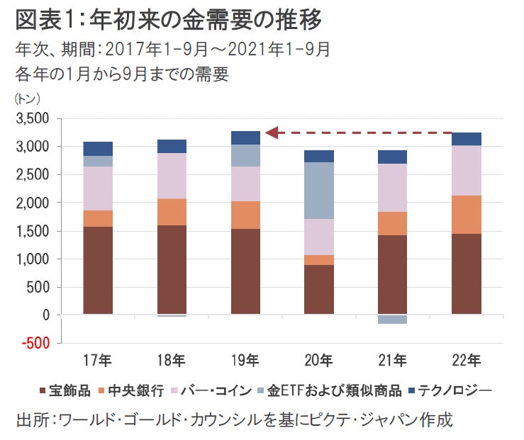 2022年1-9月期の金需要は、個人と中央銀行の需要拡大により堅調に推移し、年初来累計の金需要はコロナ前の水準を回復