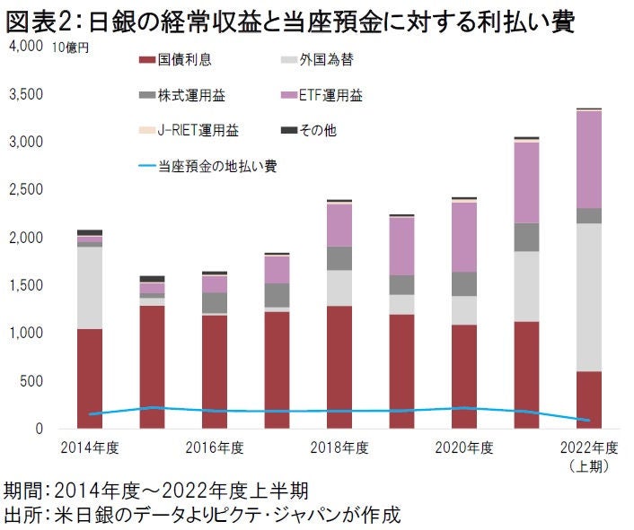一方、日銀の経常収益を見ると、この9月中間期は、為替差益が1兆5,064億円に達し利益を大きく押し上げた(図表2)。