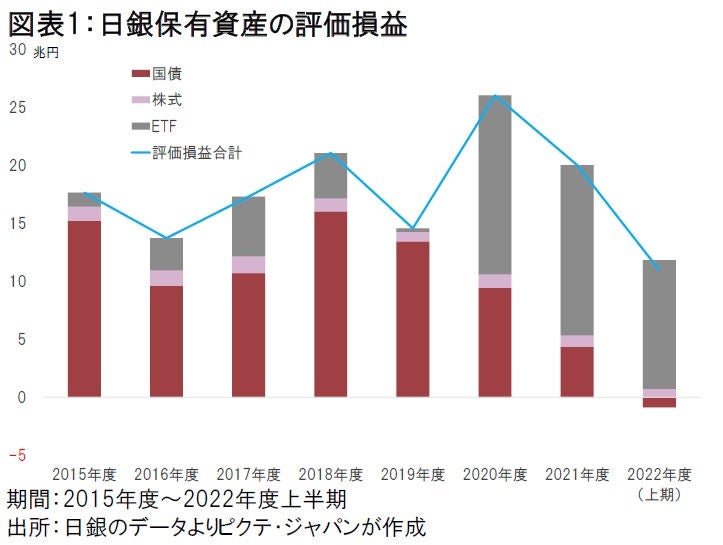日銀が11月28日に発表した2022年度9月中間決算において、保有する国債に8,749億円の評価損が生じたことが大きく報じられた(図表1)。