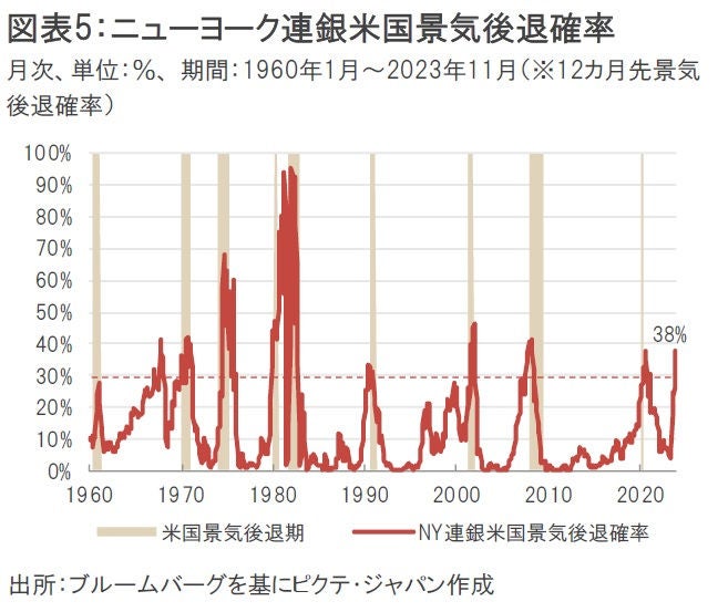 さらに警戒が必要なのは、来年の米国景気後退リスクだ。足元では力強い経済指標が相次いで発表されたが、ターミナル・レートがさらに引き上げられ、金融引き締め期間が長期化することになれば、将来的な景気後退リスクはその分高まることになる。実際、NY連銀が長短金利差から算出する12カ月先の米国景気後退確率は、景気後退入りの境目と考えられる30%の水準を超え、23年11月時点で38%まで上昇した(図表5)。米国株式市場は、神経質な相場展開が今後想定される。
