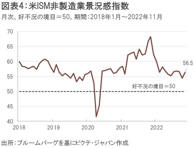 そして、市場の警戒をさらに高めるきっかけになったのが米ISM非製造業景況感指数だ(図表4)。11月は56.5と市場予想の53.5を大きく上回り、前月の54.4から上昇する結果となった。これら一連の力強い経済指標の発表を受けて、マーケットの関心は12月FOMCでの「利上げペース鈍化」観測から、「ターミナル・レートの引き上げ」と「金融引き締め期間の長期化」観測へシフトした可能性がある。株価が反落した理由はおそらくここにあるだろう。