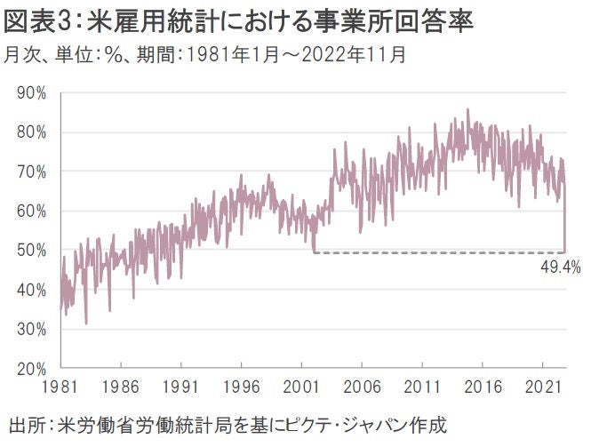 ただ、注意が必要なのは11月の雇用統計における事業所回答率の低さだ(図表3)。11月は回答率が49.4%とおよそ21年ぶりの低さになっており、11月分の雇用統計が遡及して修正される可能性が高い。どちらの方向に修正されるかは判断できないが、次回の雇用統計では前月分の修正にも目が離せなくなった。