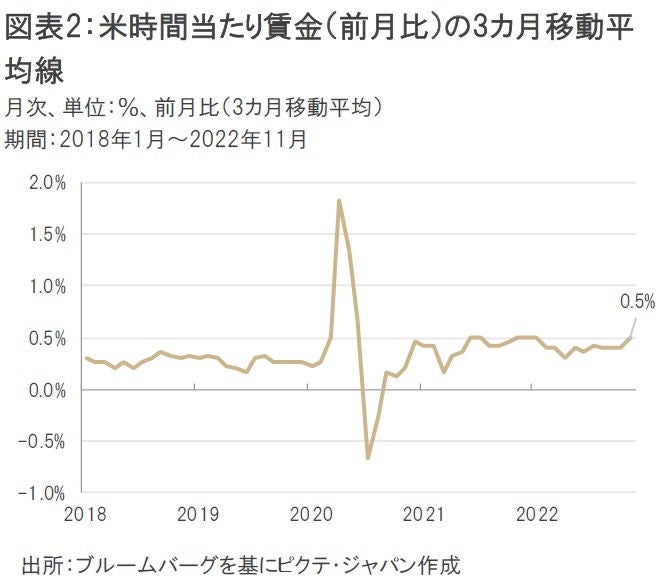 12月2日に発表された米11月雇用統計は、総じて市場予想を上回る内容となった。非農業部門雇用者数は前月比26.3万人増と市場予想の同20.0万人増を上回ったほか、10月分についても同26.1万人増から同28.4万人増へ上方修正された。さらに、時間当たり賃金も前月比+0.6%と市場予想の同+0.3%を上回り、10月分についても同+0.4%から同+0.5%へ上方修正された。この結果、時間当たり賃金の3か月移動平均は11月に+0.5%まで加速したことから、マーケットでは賃金インフレのリスクが改めて警戒される展開となった(図表2)。