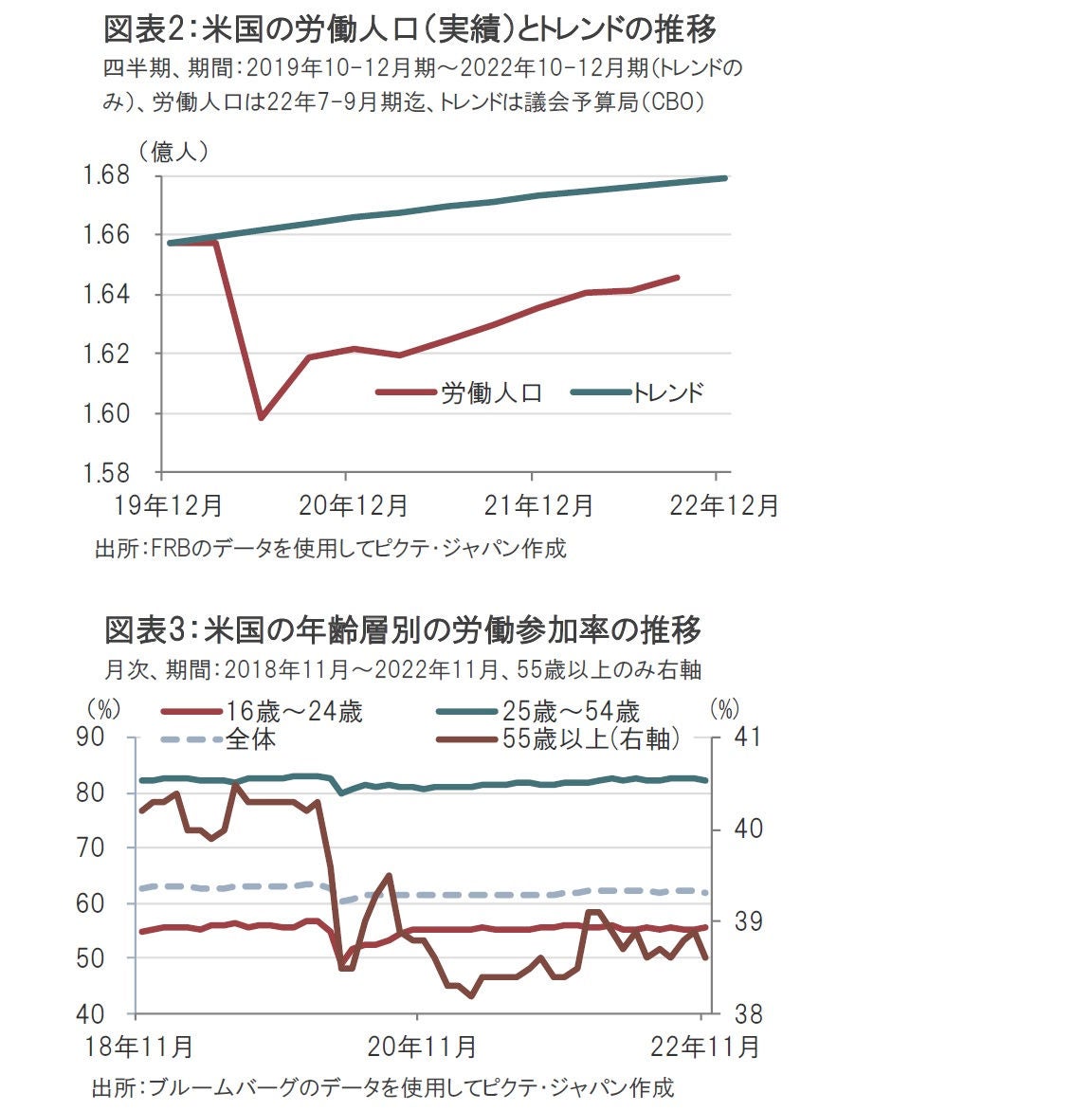 不足する労働者はどの程度か?講演では労働人口の実績と、議会予算局(CBO)がコロナ禍前に推定した労働人口のトレンドとを比較して、350万人ほど過少であると述べています(図表2参照)。