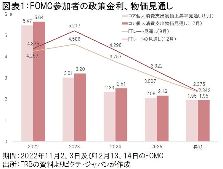 FOMC参加者19名による政策金利の見通しを加重平均すると、2023年は5.22%であり、9月時点での4.59%から63bp上昇した(図表1)。