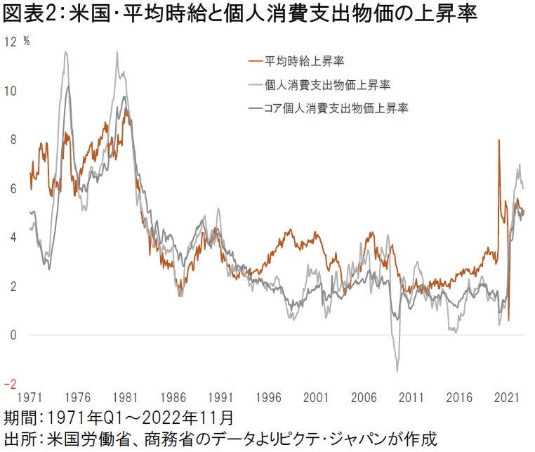 一方、2023年におけるコア個人消費支出物価の上昇率について、FOMCメンバーが想定する3.2%へと縮小するシナリオを描くのは難しい。新型コロナ禍を契機とする高齢層の早期リタイア、移民の流入減速により、労働市場が極めて逼迫しているからだ。結果として賃上げ率は高止まりが予想され、それは個人消費支出物価にも大きく影響するだろう(図表2)。