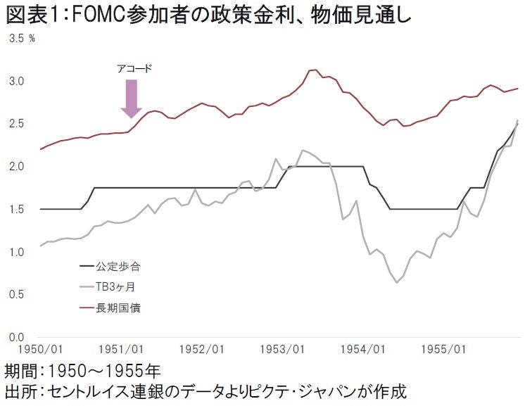 第2次大戦下の1942年、戦時公債の安定消化のため、FRBは「イールドカーブ・ターゲッティング」を採用した。出口戦略には苦労したが、1951年3月4日、ハリー・トルーマン大統領の仲介で『財務省・FRB合意』(アコード)が結ばれ、FRBは金融政策を正常化させている(図表1) 。