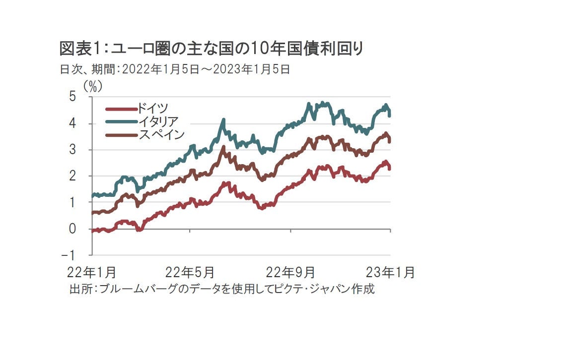 ユーロ圏の主な国の国債利回りは2023年は低下(価格は上昇)で始まりました(図表1参照)。ユーロ圏の国債利回りは昨年12月欧州中央銀行(ECB)の政策理事会で大幅利上げ継続などが示唆されたことから政策理事会後、上昇傾向となっていました。