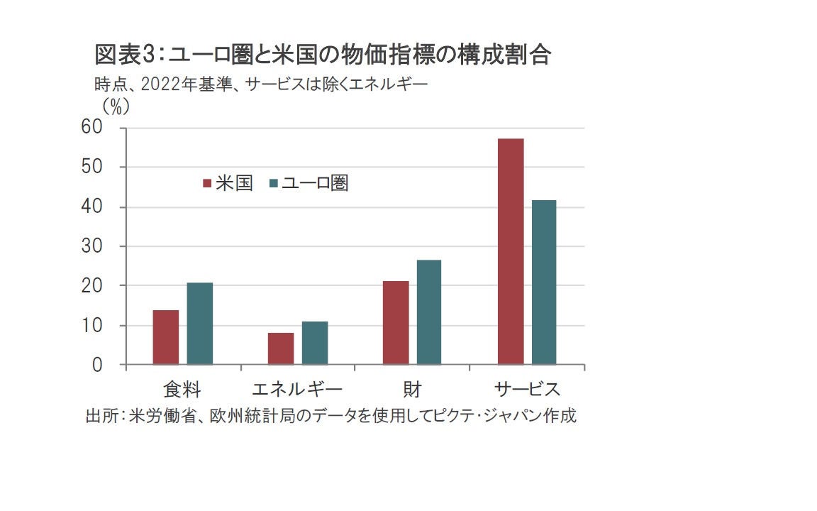 ユーロ圏と米国のCPI(ユーロ圏はHICP)をインフレ率の物価指標として比較します。物価指標の構成を部門別(食料、エネルギー、財、サービス)の割合に分類すると、ユーロ圏はサービス部門の割合が米国に比べ低い一方で、他の3部門の割合は米国より高くなっています(図表3参照)。その分、ユーロ圏は食料、エネルギー、財の各部門の構成割合が米国を上回っています。