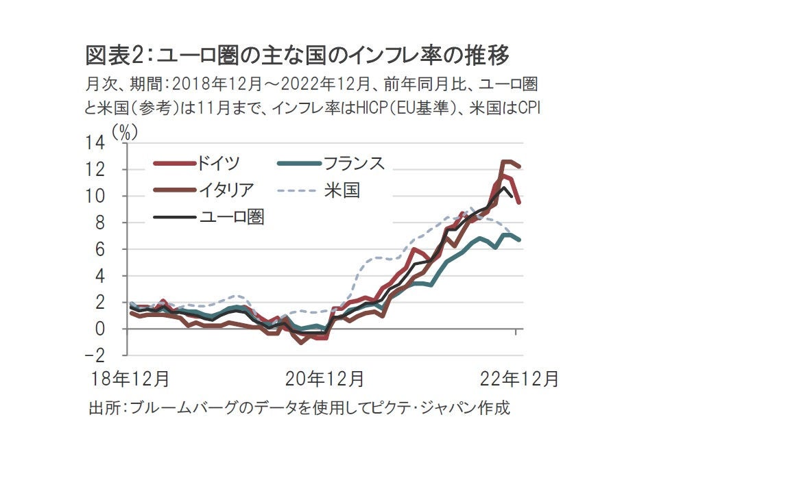 23年年初から22年12月のドイツ、フランス、イタリアの消費者物価指数(HICP、EU基準)が発表され、軒並み前月を下回りました(図表2参照)。例えば、ドイツの12月のインフレ率は前年同月比で9.6%と、市場予想の10.2%、11月の11.3%を下回りました。ユーロ圏の12月分は1月6日に公表予定ですが、ユーロ圏の主な国のインフレ率が低下したことから、12月分は11月の10.1%(確報値)を下回ることが予想されています。