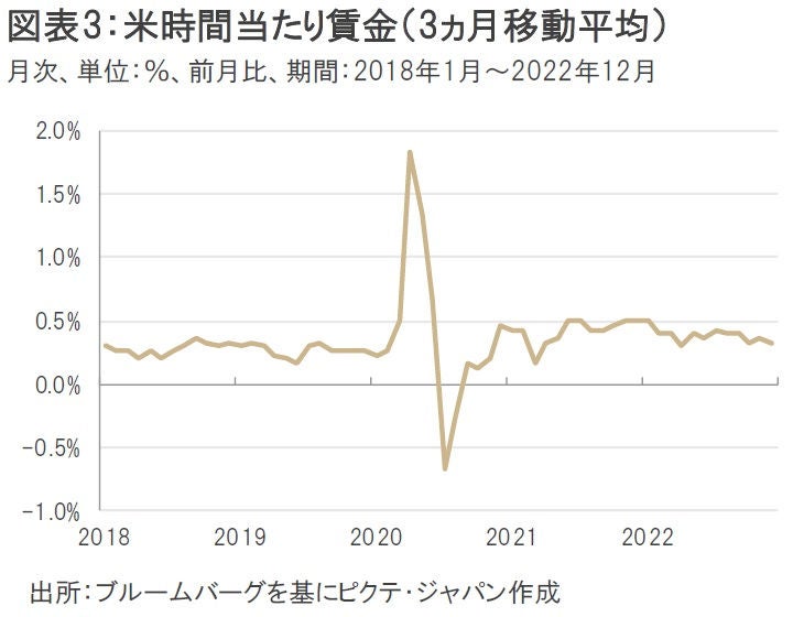 さらに、2022年12月の米時間当たり賃金は前月比+0.3%と市場予想の同+0.4%を下回ったほか、前月分についても同+0.6%から同+0.4%へ大きく下方修正された。これを受けて、3ヵ月移動平均で見た米時間当たり賃金も12月時点で+0.3%となり、賃金上昇と物価上昇がらせん(スパイラル)的に上昇する「賃金・物価スパイラル」への警戒感も後退する結果になった(図表3)。しかし、これをもって米国のインフレがピークアウトしたとみなすのは時期尚早だと考えられる。