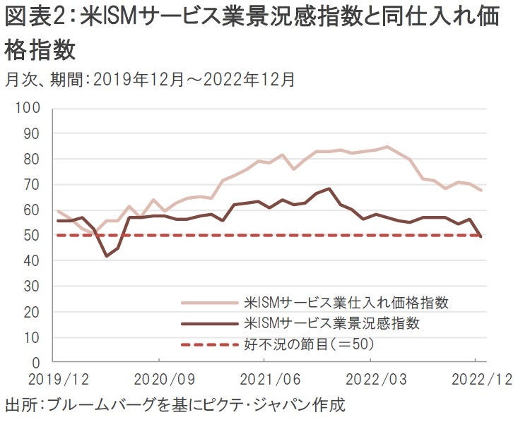 2022年12月の米ISMサービス業景況感指数は49.6となり、市場予想の55.0を大幅に下回ったほか、好不況の節目である50も割り込んだ。また、同指数の仕入れ価格指数も12月に67.6となり、前月の70.0から低下したことから、景気悪化→インフレ鈍化を同時に連想させるきっかけになったと考えられる(図表2)。
