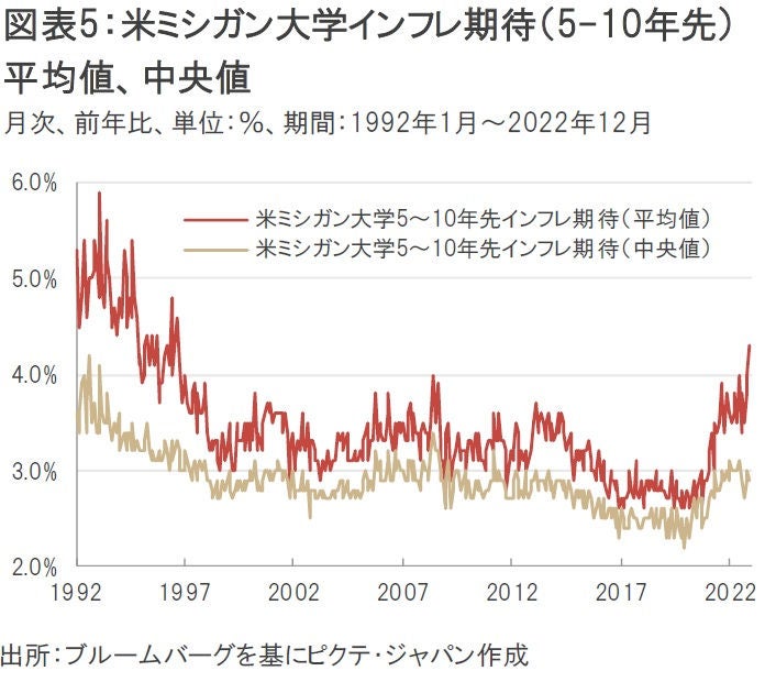インフレ期待を測る指標としては、米ミシガン大学の家計調査で算出されるインフレ期待(5-10年先)などが用いられることが多く、通常は「中央値」のデータが参照される。この指数は2022年12月(確定値)に+2.9%となり、前月の+3.0%から低下したことから、個人における長期的なインフレ期待も抑制された状態にあると一般的には判断されるだろう。しかし、普段あまり注目されない同指数の「平均値」は2022年12月に+4.3%をつけ、1996年7月以来の水準まで加速していることはあまり知られていない(図表5)。