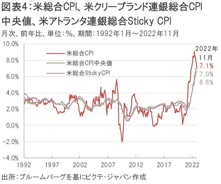 基調的なインフレ率を反映する指標としては、米クリーブランド連銀が算出する米総合CPI中央値と米アトランタ連銀が算出する米総合Sticky CPI(一度上昇し始めると中々下がりにくい「粘着性」のある品目を集めた物価指標)などが挙げられる。前者は2022年11月に前年比+7.0%となり、前月の同+7.0%から高止まりの状態が続いている。また、後者も11月は同+6.6%と前月の同+6.5%からむしろ加速している。米CPI総合が2022年6月をピークに鈍化傾向にあるのとは対照的な動きになっている(図表4)。
