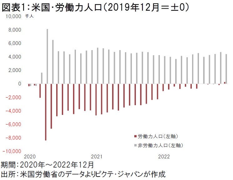 2019年12月と比べた昨年12月における米国の生産人口は、534万人増加した。ただし、非労働力人口が472万人増となる一方、労働力人口は62万人しか増えていない(図表1)。新型コロナ禍を受け、重症化し易いと言われた65歳未満のシニア層が早期引退したことが背景だろう。