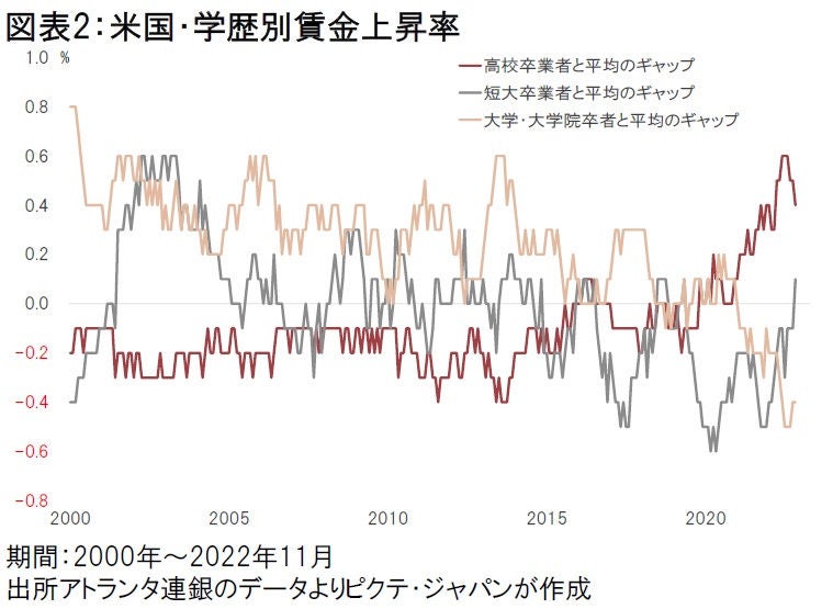 米国では、長期間に亘り大学・大学院卒者の賃金の伸びが高卒者を上回っていたが、足元は逆転した(図表2)。IT、金融など相対的に給与水準の高い業種の賃上げが鈍化したことで、全体の賃上げ率も影響を受けるだろう。ただし、数的には圧倒的に大きな労働集約型産業の人手不足は、継続的な賃上げを通じて物価上昇の背景となる見込みだ。