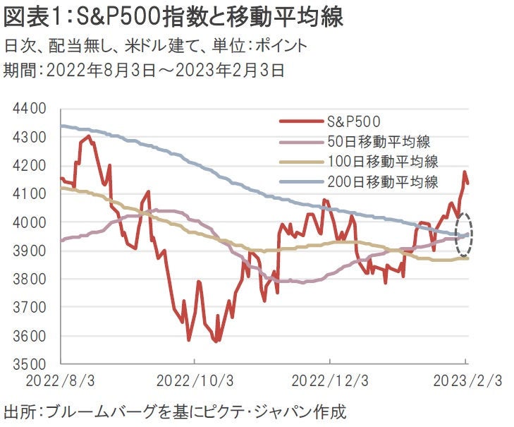 S&P500指数は1月27日(金)の終値から2月3日(金)の終値まで1.6%高となり、50日移動平均線が200日移動平均線を下から突き抜ける「ゴールデン・クロス」も2日に形成された(図表1)。
