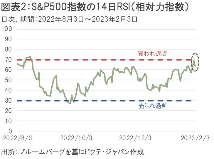 30日(月)はIMF(国際通貨基金)が2023年の世界経済見通し(実質GDP成長率)を+2.9%と発表、22年10月時点の前回見通しから0.2%ポイント引き上げ、世界的な景気後退局面は想定していないとした。また、31日(火)に発表された22年10-12月期の米雇用コスト指数は前期比+1%と市場予想の同+1.1%を下回りインフレ懸念がやや後退した。1日(水)にはFOMC(米連邦公開市場委員会)で市場予想通り0.25%の利上げが決定されたものの、FOMC後の記者会見でパウエルFRB(米連邦準備制度理事会)議長はディスインフレが進行中であると言及し、株高をたしなめるような発言が出なかったことがポジティブ・サプライズとなった。さらに、2日(木)のECB(欧州中央銀行)理事会では市場予想通り0.5%の利上げが決定されたが、ラガルドECB総裁の記者会見も市場が想定していたほどタカ派的ではなかったことが好感された。また、22年10-12月期決算発表をきっかけにメタ・プラットフォームズが前日比23.3%上昇したこともS&P500指数を押し上げた。これらを背景にS&P500指数の14日RSI(相対力指数)は2日時点で買われ過ぎ水準目前の69まで上昇し、やや過熱感が見られる状況となった(図表2)。