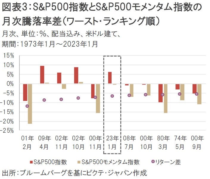 米国株式市場の「リターン・リバーサル(株価が上昇していた銘柄が急反落し、下落していた銘柄が急反発する現象)」も極端な動きとなった。過去50年分のS&P500モメンタム指数(過去12カ月間の株価上昇率が高い銘柄群)とS&P500指数の月間騰落率差(配当込み)を計算したところ、23年1月はワースト6位(-6.8%)に入るほど、S&P500モメンタム指数のリターンがS&P500指数のリターンに対して極端に劣後した(図表3)。