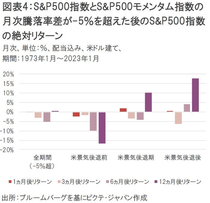 ちなみに、過去50年間の月間騰落率差の平均値は+0.2%、標準偏差は2.2%なので、23年1月の月間騰落率差は3標準偏差を超えた計算になる。このようにモメンタム指数が市場全体に対して大幅に劣後する極端な「リターン・リバーサル」が出現する局面は、米国の景気後退期前後であることが多い。例えば、ワースト1位だった01年2月は景気後退期の約1カ月前、ワースト2位の09年4月は景気後退期の最中、ワースト3位の02年11月は景気後退期から約12カ月後だ。この月間騰落率差が-5.0%よりも悪化した「リターン・リバーサル」局面を景気後退前、景気後退期、景気後退後に分類し、「リターン・リバーサル」が出現した後のS&P500指数の絶対リターンを計測したのが図表4だ。