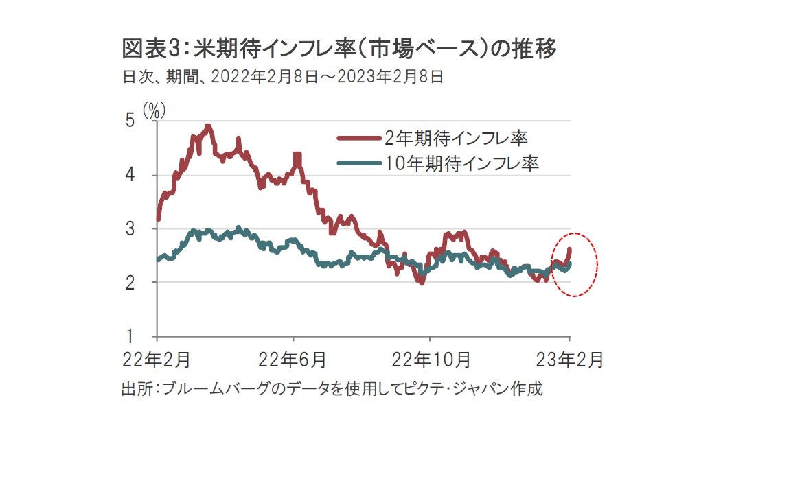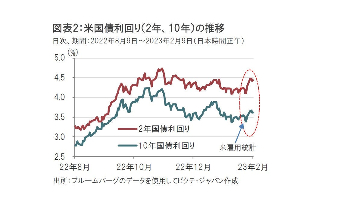 1月の米雇用統計から最近のFOMC参加者の発言までの間の米国債利回りの動きを整理します。2月1日に発表されたFOMCで政策金利であるフェデラルファンド(FF)金利は4.25%-4.50%に設定されました。米雇用統計前、市場では次の3月FOMCでさらに0.25%引き上げ、4.50%-4.75%で利上げ停止(ターミナルレート)を見込む動きも見られました。しかし、米雇用統計を受け、米国債利回りは急上昇し(図表2参照)、ターミナルレートは12月のFOMCが示唆した5.00%-5.25%(5.125%)へと見通しを修正する方向となりました。こうした中で、今週はパウエル議長やウォラー理事の発言が注目されました。